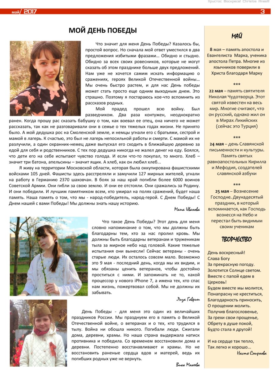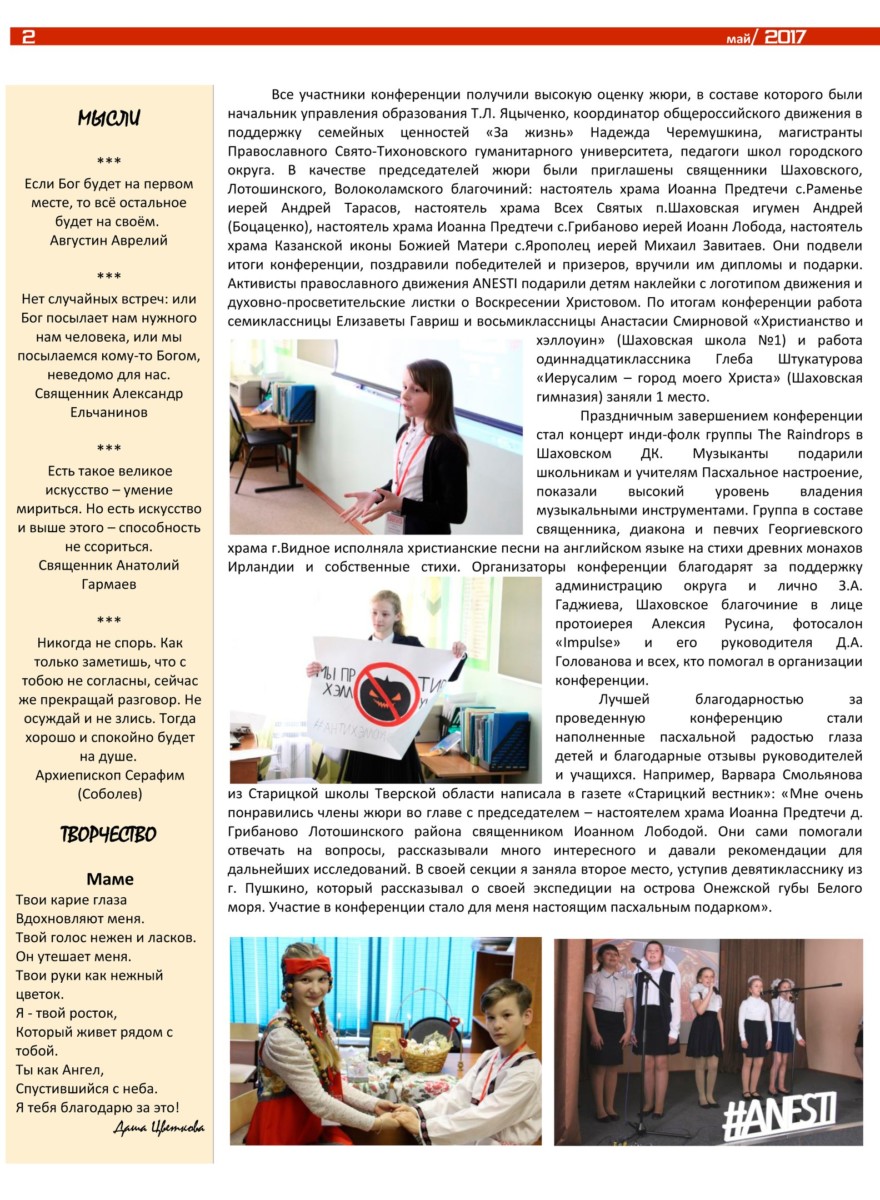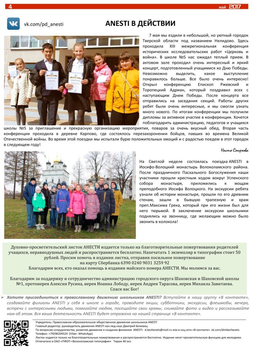 Вышел майский номер нашего просветительского листка АНЕСТИ. В нем вы узнаете о том, как участники движения провели III межрегиональную православную конференцию учащихся и студентов Москвы, Подмосковья и Тверской области. Надеемся, что вам будет интересно прочитать мнение наших активистов о празднике Дня победы. Также в этом номере впервые появилась рубрика «Творчество», где вы найдете первые стихи участников движения.