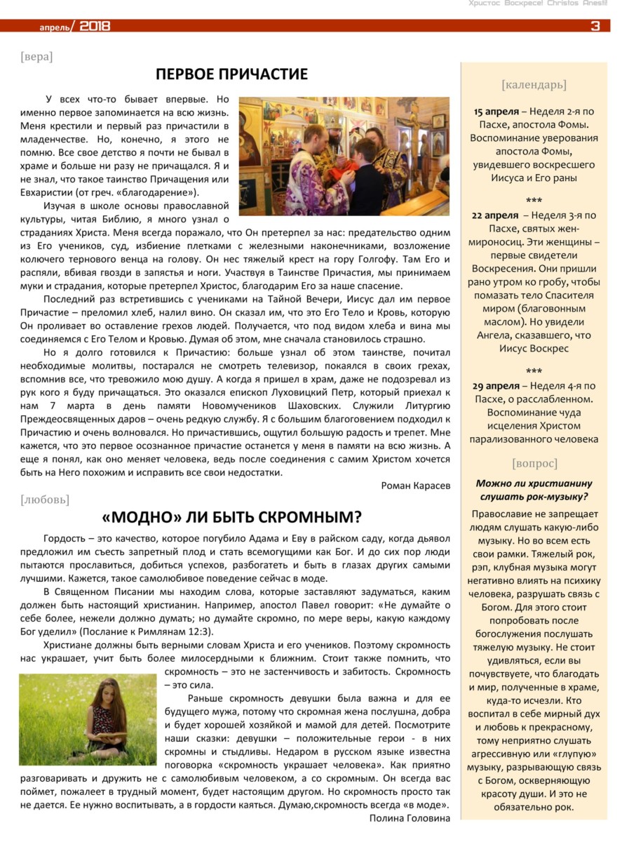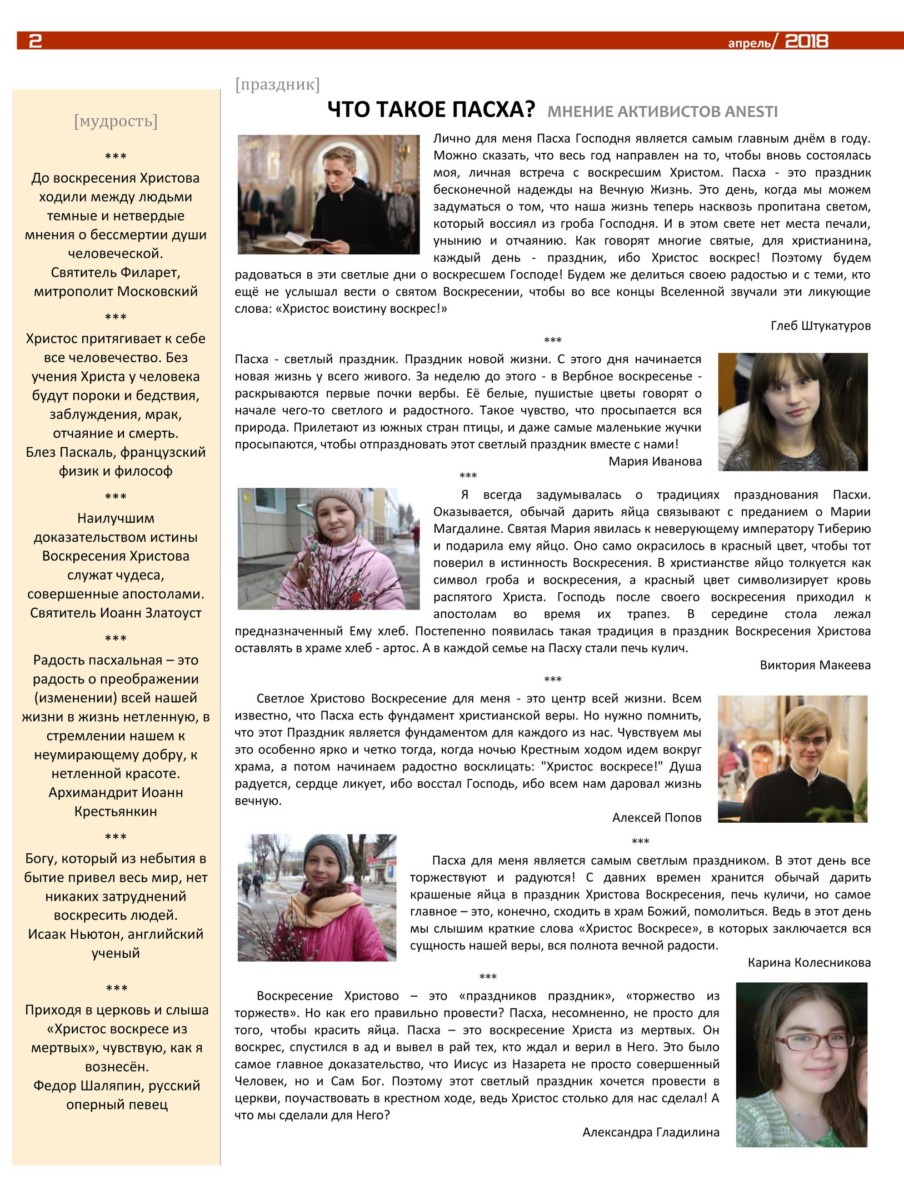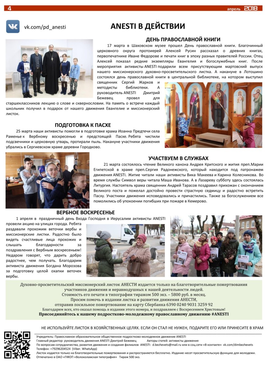 Апрельский номер нашего листка «Анести». В этом месяце мы распечатали и раздали 600 штук! Этот номер посвящен Пасхе, традициям ее празднования и нашим новостям за время Великого поста.