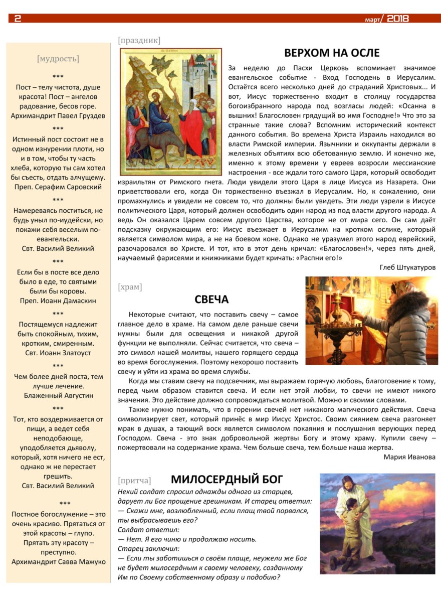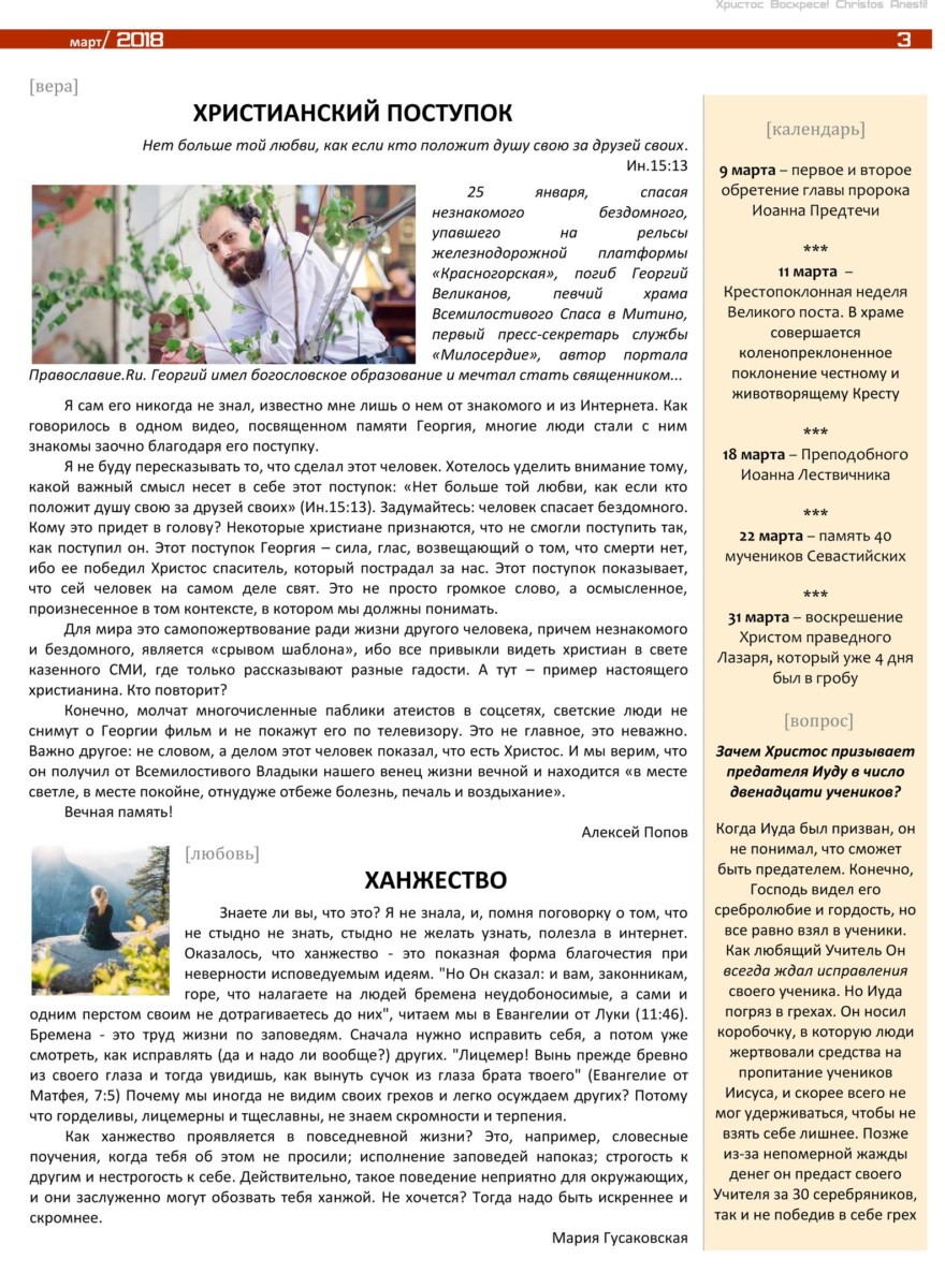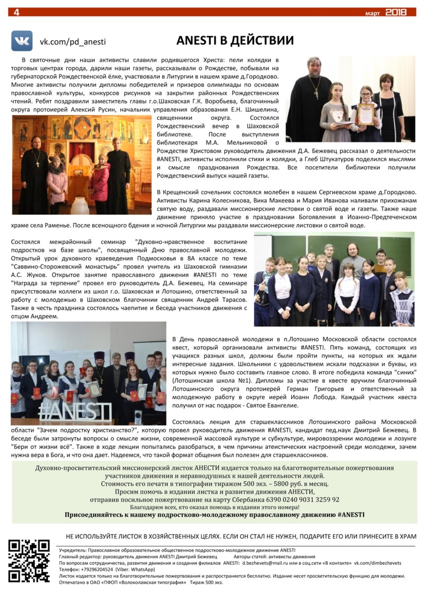 Вышел мартовский номер нашего просветительского листка «Анести». Мы посвятили его Великому посту, предстоящим праздникам, подвигу Георгия Великанова и другому. Благодарим всех, кто оказал помощь в его издании тиражом 500 экз.